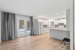 - The kitchen features quartz counters and French doors off the family room to the deck