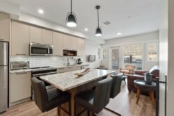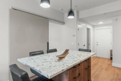 • A large island with matching stone counter, room to seat 4 and generous drawers provides the perfect space for entertaining, meal prep or casual dining