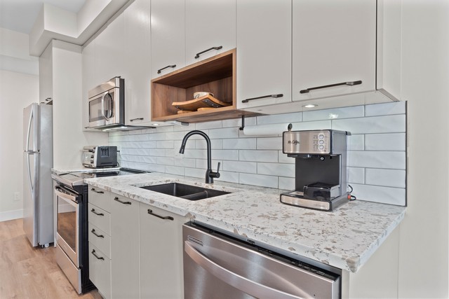 • The stunning kitchen showcases beautiful stone countertops, refinished cabinetry with updated hardware, an undermount black sink with modern faucet, stainless steel appliances and added pot lighting