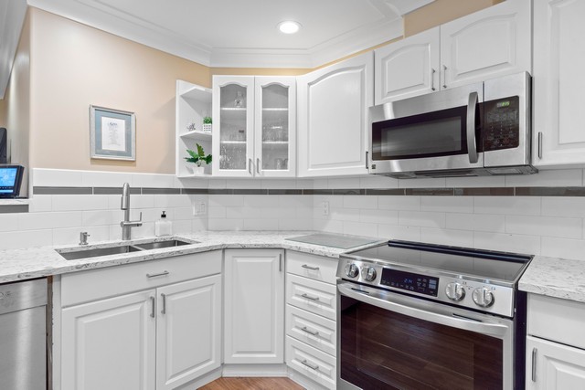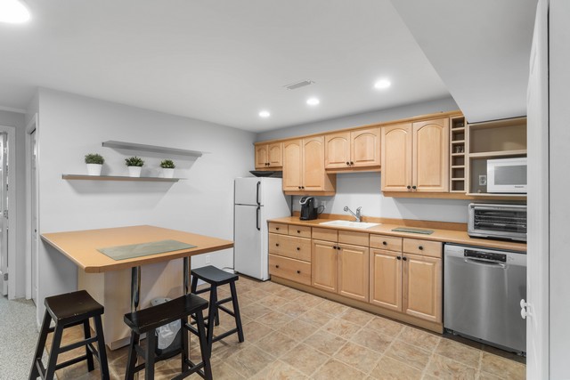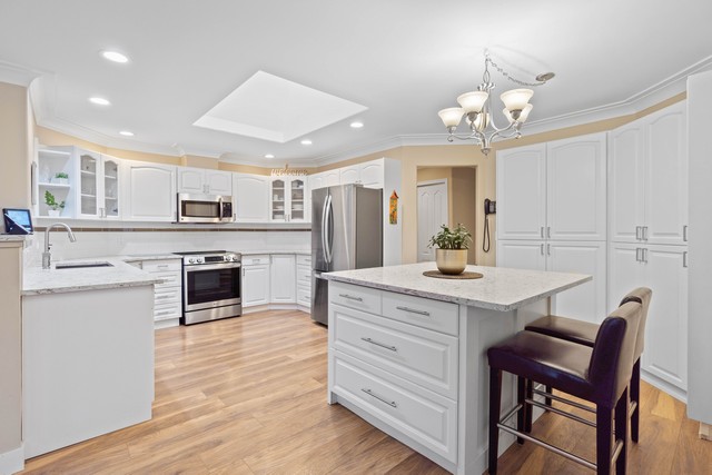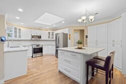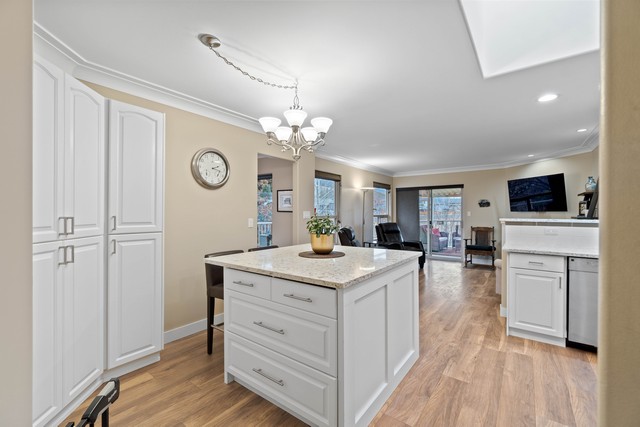 - Updated cabinetry, generous counter space, one year old stainless appliances and a skylight allowing for plenty of natural light in the bright island kitchen