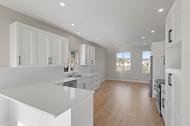 - You’ll love the bright peninsula kitchen with ample cabinets and counter space plus the convenience of laundry on both levels