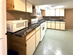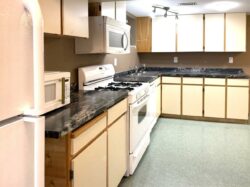- The kitchen offers plenty of cabinet space and includes fridge and stove