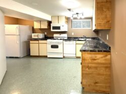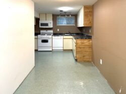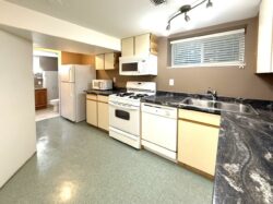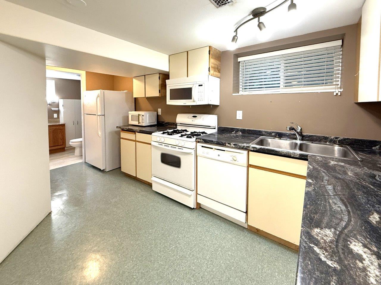 - The suite is accessed through a bright shared laundry area with washer and dryer included and features a large L-shaped kitchen equipped with a fridge, gas range, dishwasher and microwave