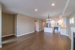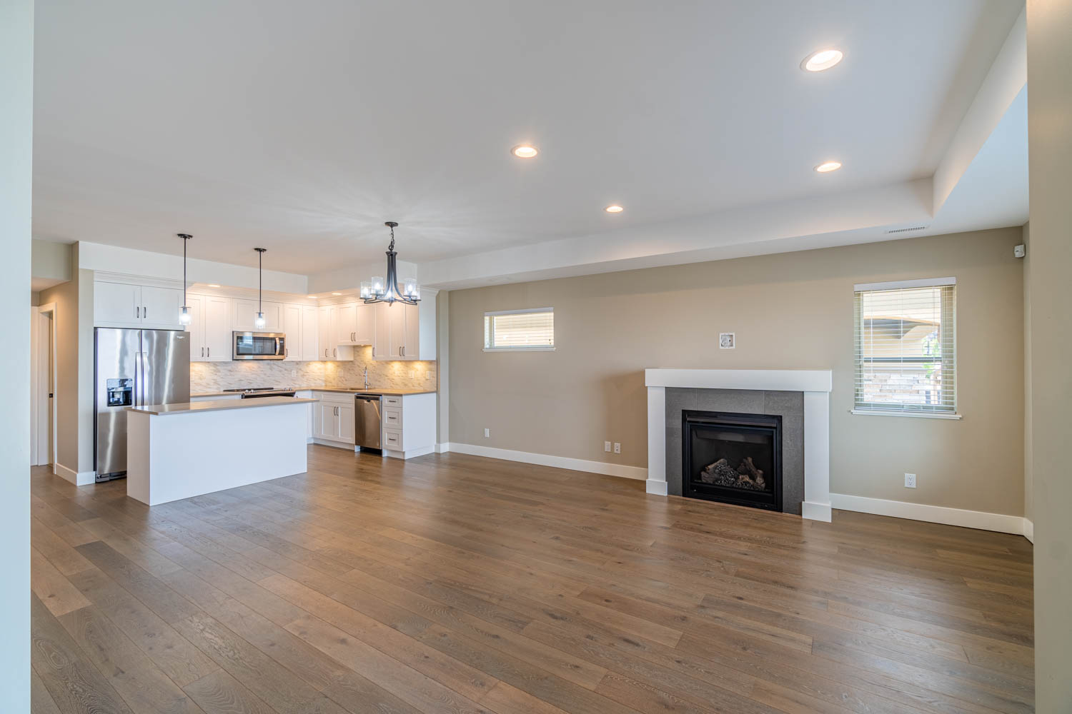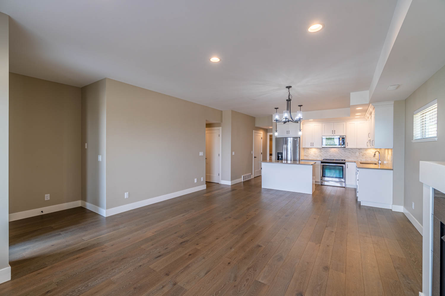 - The kitchen includes stainless steel appliances, granite countertops and a large island and opens to the living room with a natural gas fireplace and large windows to the view